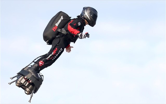 O Γάλλος εφευρέτης Φράνκι Ζαπάτα έγινε ο πρώτος άνθρωπος στην ιστορία που πέρασε τη Μάγχη πετώντας με την αεριωθούμενη ιπτάμενη σανίδα/ flyboard του.