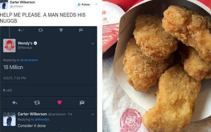Αν και δεν πέτυχε τον στόχο που είχε ορίσει το ταχυφαγείο, 18 εκατομμύρια retweet, τα Wendy’s του έδωσαν τις μπουκιές που επιθυμούσε.