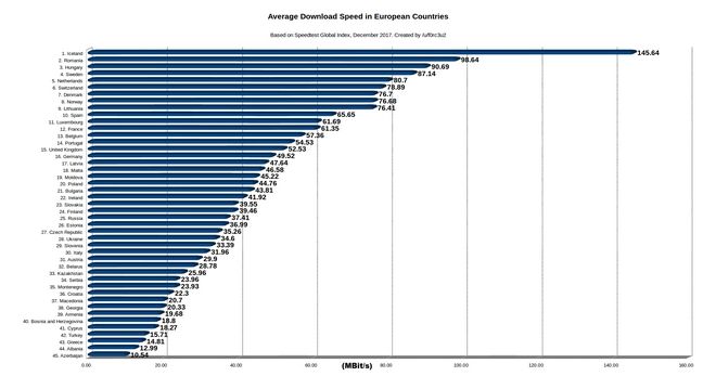 Συγκεκριμένα με βάση το Speedtest Global Index του Δεκεμβρίου του 2017 η Ελλάδα καταλαμβάνει την 43 θέση στην Ευρώπη έχοντας μόνες χώρες πίσω της την Αλβανία και το Αζερμπαϊτζάν. Η Ισλανδία η οποία βρίσκεται στην πρώτη θέση στην ήπειρο μας “τρέχει” με δεκαπλάσια μέση ταχύτητα σε σχέση με την Ελλάδα, ενώ η βαλκανική Ρουμανία με μέση ταχύτητα 98,64 Mbps στο download. Η τελευταία μαζί με την Ουγγαρία που την ακολουθεί έχουν πετύχει να προσθέσουν ένα σημαντικό πλεονέκτημα στις προσέλευση ξένων εταιρειών στα εδάφη τους.
