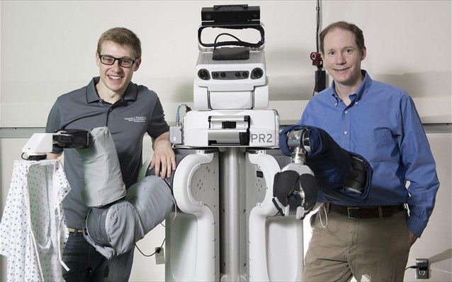 Πολλοί άνθρωποι χρειάζονται βοήθεια για να ντύνονται, είτε λόγω ηλικίας, είτε λόγω τραυματισμών, είτε λόγω διαφόρων παθήσεων. Εύκολα γίνεται αντιληπτό ότι τα ρομπότ θα μπορούσαν να βοηθήσουν σε κάτι τέτοιο, αλλά πρόκειται για μια δύσκολη υπόθεση, καθώς το ύφασμα και το ανθρώπινο σώμα είναι πολύπλοκα αντικείμενα- ωστόσο αυτός ακριβώς είναι ο ρόλος ενός ρομπότ του Georgia Institute of Technology (Georgia Tech), που περνά ρούχα νοσοκομείου στα χέρια ανθρώπων. Το ρομπότ αυτό δεν χρησιμοποιεί «μάτια» καθώς χειρίζεται το ύφασμα- αντ’αυτού βασίζεται στις δυνάμεις που αντιλαμβάνεται καθώς καθοδηγεί το ρούχο στο χέρι, γύρω από τον αγκώνα και στον ώμο.