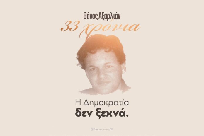 Με αφορμή τη συμπλήρωση 33 χρόνων από τη δολοφονία του Θάνου Αξαρλιάν ο Κυριάκος Μητσοτάκης τίμησε τη μνήμη του με μια ανάρτηση.