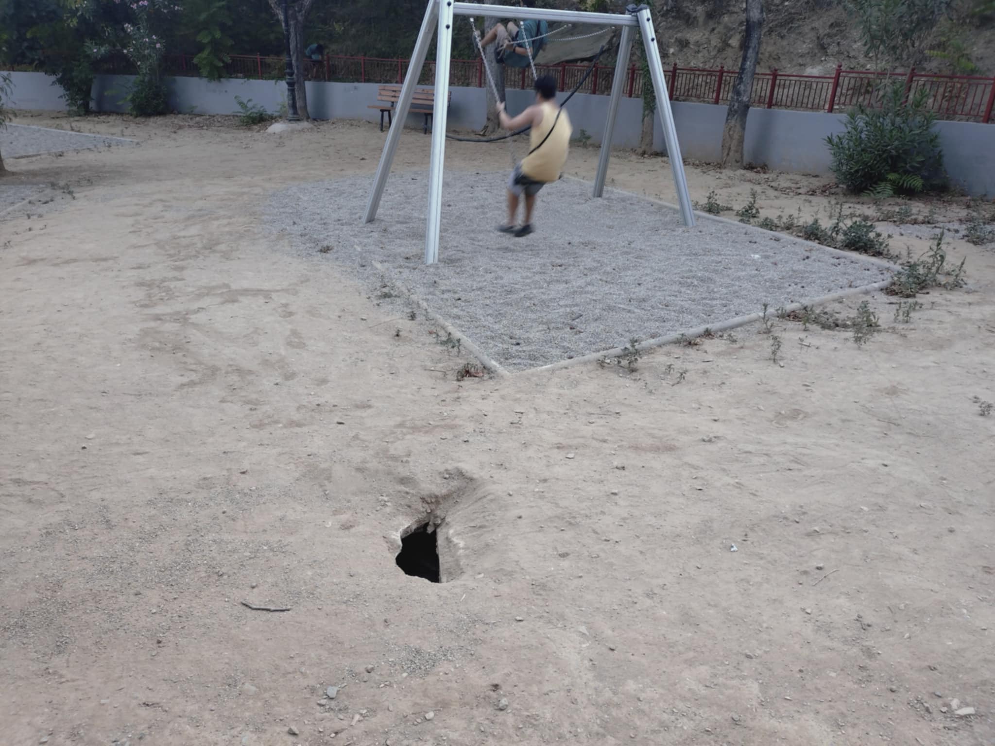Στην πρόσφατα ανακαινισμένη παιδική χαρά στον Άγιο Ονούφριο, λίγα εκατοστά μακριά από τις κούνιες, που παίζουν τα παιδάκια και άνοιξε μία τρύπα, ένας κρατήρας, βγαλμένος από ταινία επιστημονικής ταινίας! Είναι σαν ο δήμος που είναι υπεύθυνος για τις παιδικές χαρές να σου λέει, αν δεν φας το φαΐ σου θα σε στείλω στην… τρύπα του Αγ. Ονουφρίου. Επειδή όμως εδώ δεν είναι ταινία, αλλά πραγματικότητα, οι υπεύθυνοι να τρέξουν άμεσα στο σημείο και να δουν τι πρέπει να κάνουν, γιατί εάν ένα παιδάκι πέσει μέσα στην τρύπα, τότε θα ξεμπερδέματα, δεν θα είναι καλά.