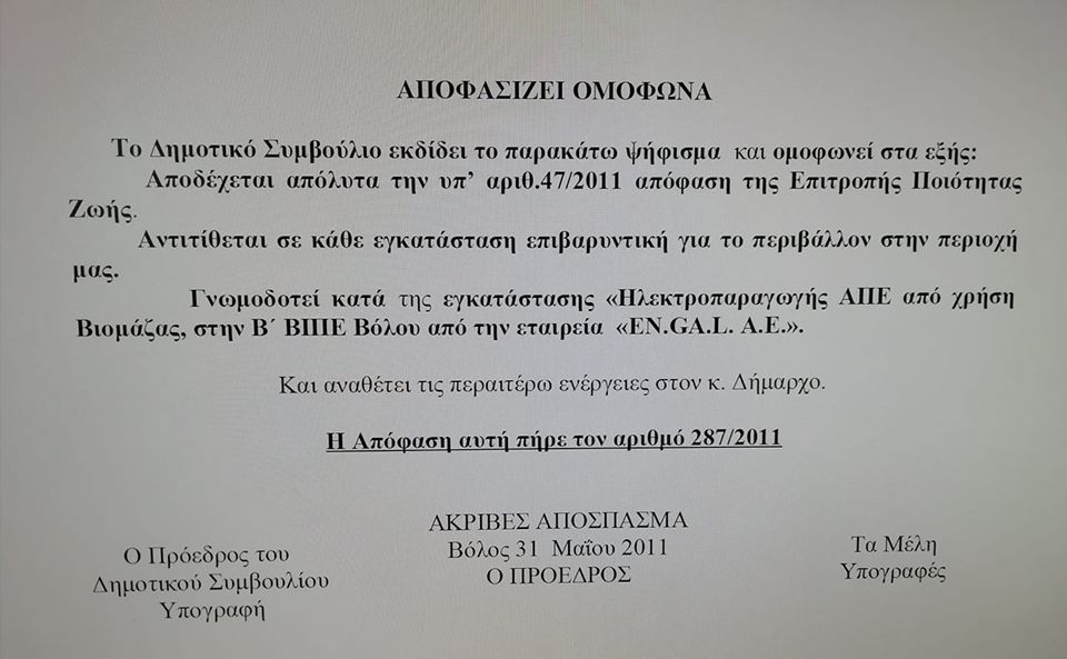 «Μάϊος 2011 πριν την κωλοτούμπα. Και καλά ο νυν Δήμαρχος και τότε ποδοσφαιρικός παράγοντας την εποχή εκείνη είχε άλλες ασχολίες με τα play off της Σούπερ Λιγκ. Δεν ήταν στις προτεραιότητες του το περιβάλλον. Οι κ. Μουλάς, Μπατζιάκας, Ζαρκάδας- Βεργής δημοτικοί σύμβουλοι τότε με την Ζέτα Μακρή (νυν βουλευτής μην ξεχνιόμαστε) και τώρα εκ νέου αιρετοί με την πλειοψηφία, μπορούν να μας πουν πως αποφάσισαν διαφορετικά το 2011 σε σχέση με το 2020; Τότε, το Δημοτικό Συμβούλιο με ομόφωνη απόφαση ( έπειτα από επίσης ομόφωνη απόφαση της Επιτροπής Ποιότητας Ζωής) γνωμοδότησε κατά της εγκατάστασης «Ηλεκτροπαραγωγής ΑΠΕ από χρήση Βιομάζας, στην Β΄ ΒΙΠΕ Βόλου από την εταιρεία «EΝ.GA.L. Α.Ε.». Προηγήθηκε διαβούλευση υπό κανονικές συνθήκες, καλέστηκαν φορείς, αιτιολογήθηκε σε βάθος η απόφαση και μπήκε ταφόπλακα. Ταφόπλακα για μια πολύ πιο ‘’light’’ περίπτωση από την καύση SRF, επειδή κρίθηκε ότι δεν ήταν περιβαλλοντική επένδυση καθώς για την βιομάζα η μελέτη προέβλεπε ότι θα αποτελείται από 65% χαρτί και χαρτόνι, 25% απόβλητα κλωστοϋφαντουργίας και 10% σύνθετα υλικά, για τα οποία γενικώς και αορίστως δεν διευκρινίζανε τι ακριβώς θα περιείχε αυτό το 10%. Ας εξηγήσουν αν μπορούν πως έγινε και άλλαξε ο Μανωλιός και έβαλε τα ρούχα του αλλιώς…» έλεγε ο επικεφαλής της δημοτικής κίνησης «Μαζί για το Βόλο», δημοτικός σύμβουλος, κ. Ιάσονας Αποστολάκης.