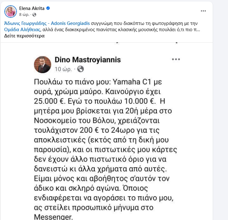 Για το θέμα του Βολιώτη μουσικού, Ντίνου Μαστρογιάννη, που βρέθηκε στη δύσκολη θέση να πουλήσει το αγαπημένο του πιάνο για να περιθάλψει την μητέρα του που νοσηλεύεται στο Νοσοκομείο, απευθύνθηκε μέσα από τα κοινωνικά δίκτυα η βουλευτής Έλενα Ακρίτα στον υπουργό Υγείας, Άδωνι Γεωργιάδη. Όπως του έγραψε στο Facebook « Άδωνις Γεωργιάδης – Adonis Georgiadis συγγνώμη που διακόπτω τη φωτογράφηση με την Ομάδα Αλήθειας, αλλά ένας διακεκριμένος πιανίστας κλασικής μουσικής πουλάει ό,τι πιο πολύτιμο έχει, το πιάνο του για να καλύψει τα ιατροφαρμακευτικά έξοδα της μητέρας του που βρίσκεται στο νοσοκομείο Βόλου. Όσο για την αποκλειστική νοσηλεύτρια την πληρώνουμε από την τσέπη μας, γιατί κανείς ποτέ δεν προέβλεψε γι’ αυτό το δυσβάστακτο κόστος. Αν τελειώσατε τις πόζες με τα «παιδιά» μήπως να έριχνες μια ματιά στο δράμα του πολίτη; Ή το υπουργείο Υγείας το έχεις μόνο για ντεκόρ στις φωτογραφίες;». Απάντησε πάντως για την ώρα δεν πήρε.