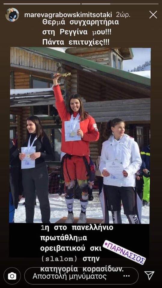 Τα συγχαρητήριά της μέσω ανάρτησής στο instagram έδωσε στη βαφτισιμιά της Ρεγγίνα Καλτσογιάννη, η σύζυγος του Κυριάκου Μητσοτάκη Μαρέβα Γκραμπόφσκι, για την 1η θέση που κατέκτησε στο πανελλήνιο πρωτάθλημα ορειβατικού σκι στον Παρνασσό το περασμένο Σαββατοκύριακο. «Θερμά συγχαρητήρια στη Ρεγγίνα μου!!! Πάντα επιτυχίες!!!» έγραψε. Οι οικογένειες Μητσοτάκη-Καλτσογιάννη πέρασαν χαλαρές στιγμές στην Αράχωβα όπου βρέθηκε ο πρόεδρος της Νέας Δημοκρατίας, για να παρακολουθήσει και να συμμετάσχει στις εργασίες του 4ου Οικονομικού Φόρουμ των Δελφών.