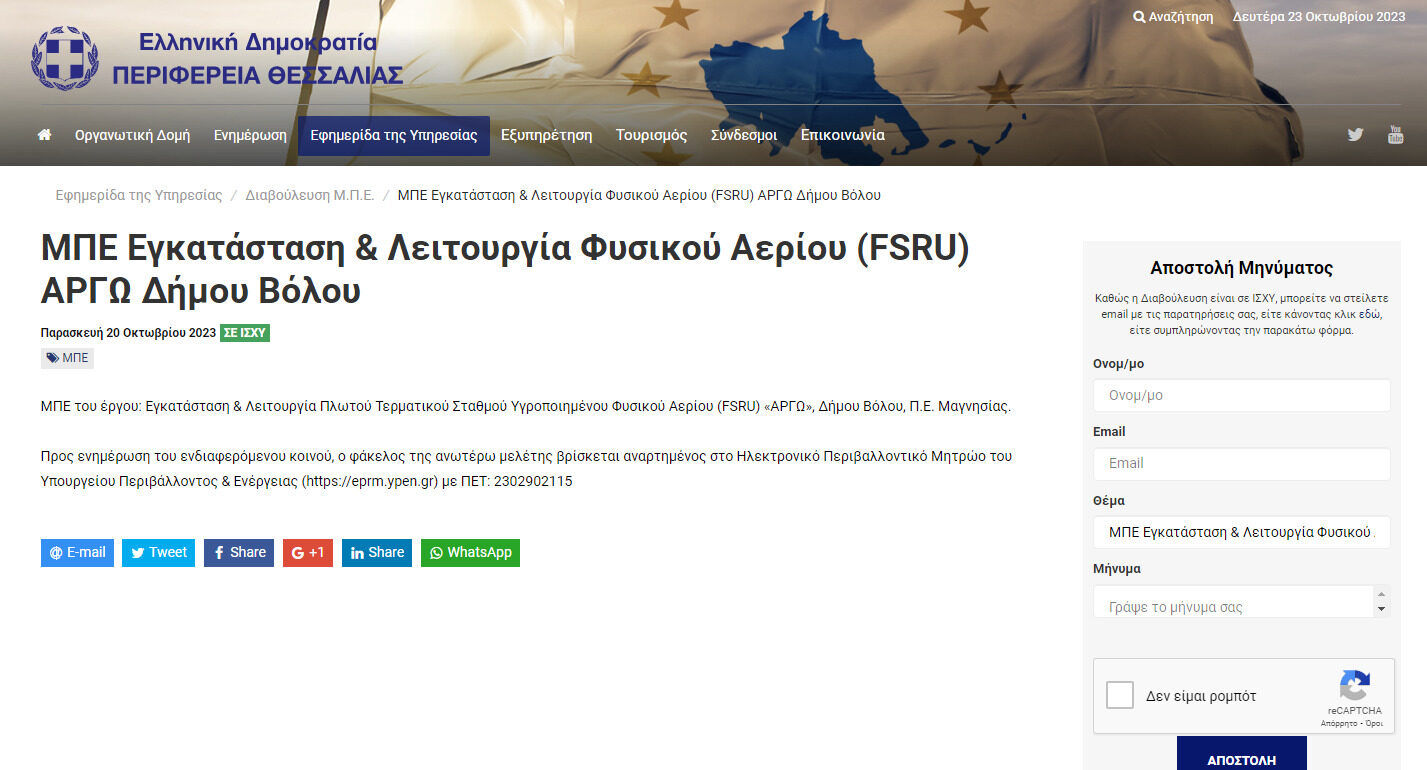 Τεχνολογικά εμπόδια βάζει το υπουργείο Περιβάλλοντος σε όσους θέλουν να συμμετέχουν στη διαβούλευση για την ΜΠΕ του FSRU Αργώ. Ενώ κάποιος μπορεί να αναρτήσει κάποιο σχόλιο στην ιστοσελίδα της Περιφέρειας Θεσσαλίας, αν θέλει να έχει πλήρη γνώση του φακέλου ώστε ο σχολιασμός του να είναι τεκμηριωμένος, πρέπει να κάνει εγγραφή μέσω Taxis στο Ηλεκτρονικό Μητρώο Περιβάλλοντος, που λειτουργεί αποτρεπτικά σε κάποιους. Πόσο δύσκολο θα ήταν να βάλουν τη Μελέτη δημόσια στην ιστοσελίδα της Περιφέρειας;