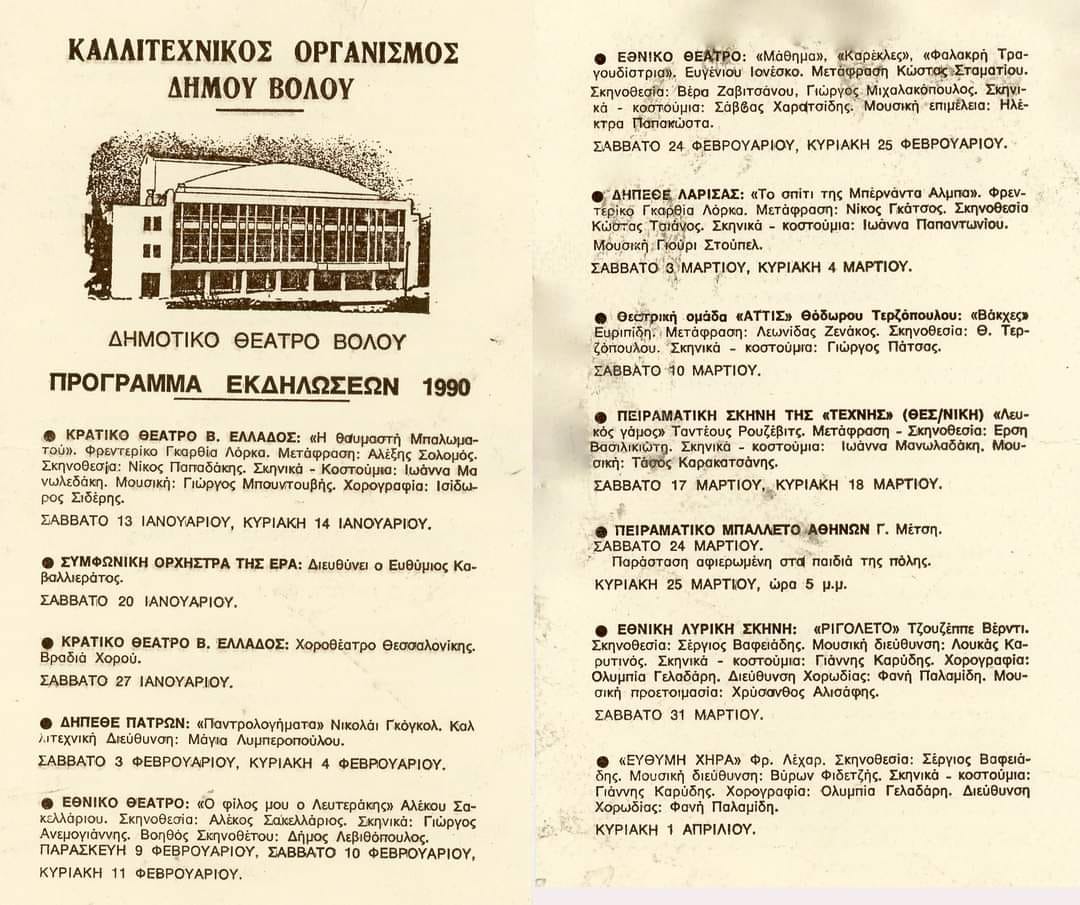 Πέρασαν πάνω από τρεις δεκαετίες και πολλά έχουν αλλάξει από τότε στον τομέα του πολιτισμού στον Βόλο, ενώ άλλα μένουν αναλλοίωτα. Τέτοιο καιρό το 1990, σύμφωνα με πρόγραμμα εκδηλώσεων, που διακινήθηκε στο διαδίκτυο, στη σκηνή του Δημοτικού Θεάτρου Βόλου ανέβαιναν τρία θεατρικά του Ευγένιου Ιονέσκο. Μεταξύ αυτών, η «Φαλακρή τραγουδίστρια», πρωτοποριακό έργο που καθιέρωσε το «θέατρο του παραλόγου». Άκουσα χθες τον Αχιλλέα Μπέο ως άλλο πρωταγωνιστή ενός θεάτρου του παραλόγου να υποστηρίζει ότι αυτός έφερε τον πολιτισμό στον Βόλο, επειδή επί των ημερών του ανακαινίστηκε το Δημοτικό Θέατρο Βόλου! Το έργο βέβαια χρηματοδοτήθηκε από την Περιφέρεια Θεσσαλίας, αλλά ας του αναγνωρίσουμε ότι συνέπραξε θετικά για να ανοίξει και πάλι τις πύλες του. Πύλες όμως οι οποίες έκλεισαν αμέσως μετά την ολοκλήρωση του σύντομου προγράμματος εκδηλώσεων μέσα στις γιορτές. Ξέρετε γιατί; Διότι το κτίριο είναι ακόμη εργοτάξιο και δεν έχει ολοκληρωθεί. Εκκρεμεί η β’ φάση που αφορά στην τοποθέτηση του οπτικοακουστικού εξοπλισμού που είναι απαραίτητος για την εύρυθμη λειτουργία του και την υποστήριξη σύγχρονων μουσικοθεατρικών παραγωγών. Γεφύρι της Άρτας το θέατρο!