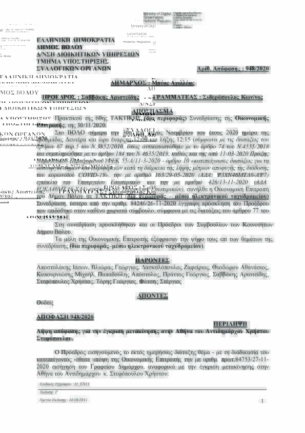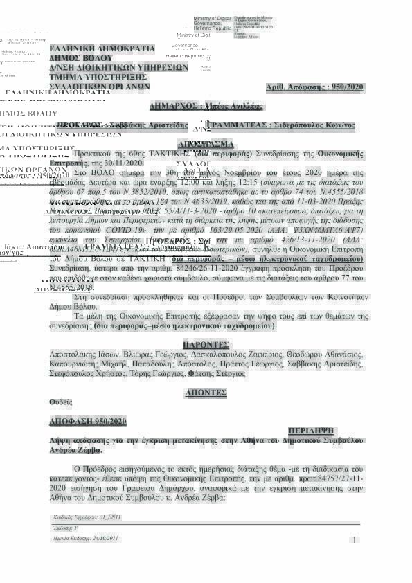 στελέχη του Υπουργείου Πολιτισμού και Αθλητισμού για την επίλυση σημαντικού θέματος του Δήμου που αφορά στην δημιουργία Μουσείου του παλαιού Δημοτικού Κοιμητηρίου Βόλου! Έργο ύψιστης προτεραιότητας για τη Δημοτική Αρχή Μπέου. Για το σκοπό αυτό εγκρίθηκε το ποσό των 20 ευρώ έκαστος για τα έξοδα της εκτός έδρας μετακίνησής τους. Τζάμπα τη βγάλαμε συμπολίτες! Αυτοί παλεύουν να μας φτιάξουν ολόκληρο Μουσείο και αποζημιώνονται με ένα εικοσαρικάκι. Ισα – ίσα τα σάντουιτς και ένα αναψυκτικό για το δρόμο, γιατί το εισιτήριο για το παιχνίδι που πήγαν να δουν μετά (αφού ολοκληρώθηκε η συνάντηση στο υπουργείο) ήταν εξασφαλισμένο από τον Δήμαρχο και πρόεδρο της ομάδας Αχιλλέα Μπέο.