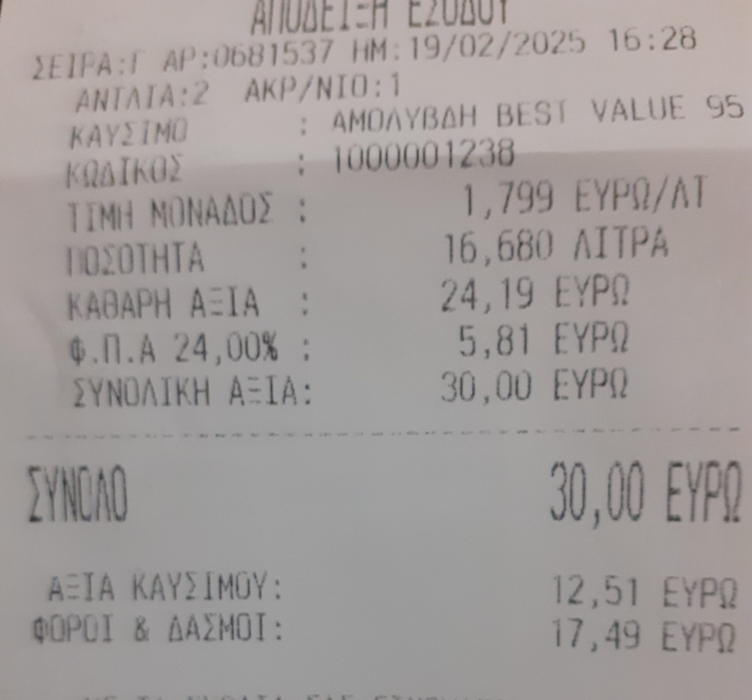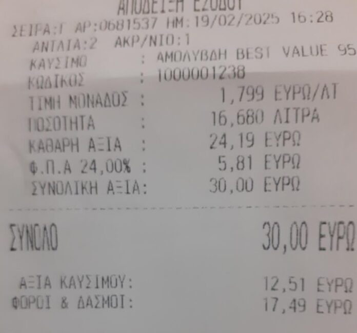 Μα καλά, δεν ξέρουμε ειλικρινά σε ποιο άλλο είδος ή υπηρεσία καθώς και σε ποια άλλη χώρα, μπορεί να συμβαίνει αυτό! Η αξία του προϊόντος που αγοράζει κανείς να είναι χαμηλότερη σε σχέση με τους φόρους που πληρώνει! Με άλλα λόγια, αν δείτε την απόδειξη του σχολίου μας, θα διαπιστώσετε ότι στα 30 ευρώ αμόλυβδης βενζίνης, με τιμή μονάδας για προχθές στα 1,799 ευρώ αλλά λίτρο, η αξία του καυσίμου είναι 12,51 ευρώ και οι φόροι και δασμοί είναι 17,49 ευρώ!