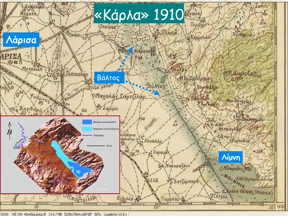 - Τι ήταν στην πραγματικότητα η «ΚΑΡΛΑ» ; Όπως μπορείτε να δείτε και από τον χάρτη του 1910, πρόκειται για μία λίμνη, δίπλα σε μία τριπλάσια έκταση αγρών και βάλτων, τους οποίους τροφοδοτούσε κατά περιόδους ο Πηνειός.