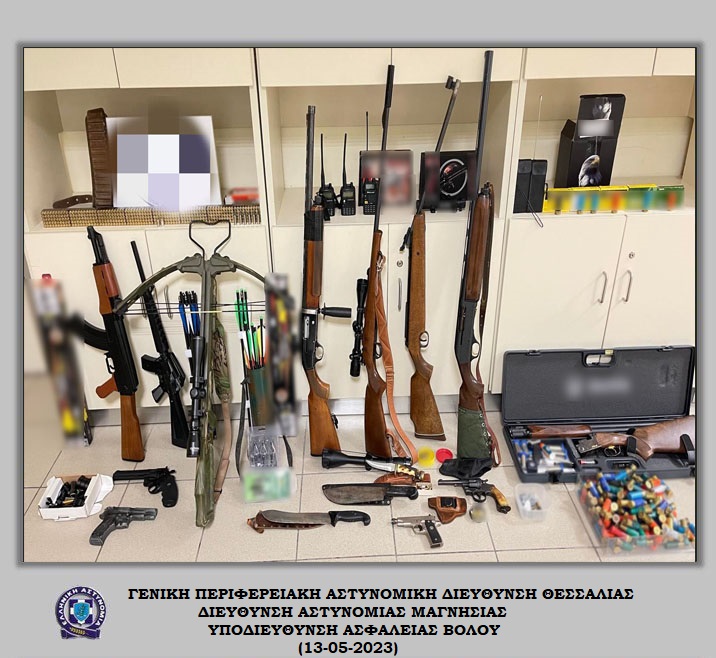 -1- πιστόλι με γεμιστήρα που περιείχε δύο φυσίγγια, -1- περίστροφο με βυκίο, περιέχον έξι φυσίγγια, -1- αεροβόλο περίστροφο, -1- αεροβόλο τυφέκιο, -1- τυφέκιο με προσαρμοσμένη σκοπευτική διόπτρα και σιγαστήρα, -1- δίκαννο κυνηγετικό όπλο, -1- κυνηγετική καραμπίνα, -1- κυνηγετική καραμπίνα με πρόσθετο σκοπευτικό τύπου λέιζερ και προσαρμοσμένα στο κοντάκι του φακό χειρός και πλαστική λαβή στο κάτω μέρος αυτής, -2- απομιμήσεις πυροβόλων πολεμικών τυφεκίων, -1- απομίμηση πυροβόλου όπλου πιστολιού, -620- φυσίγγια ποικίλων τύπων και διαμετρημάτων, -1- ζώνη μεταφοράς κυνηγετικών φυσιγγίων, -1- συσκευασία με πλήθος μεταλλικών βολίδων αεροβόλου όπλου, -18- κάλυκες, -1- πλαστικό σακουλάκι με ποσότητα βολίδων κυνηγετικού όπλου (σκάγια), συνολικού βάρους 224 γραμμαρίων, -3- φορητοί ψηφιακοί πομποδέκτες, -2- φορητοί πομποδέκτες (ασύρματοι), -1- βαλλίστρα με προσαρμοσμένη σκοπευτική διόπτρα, -3- μεμονωμένες σκοπευτικές διόπτρες, -1- πλαστική φαρέτρα με -8- βέλη, -4- χάρτινες συσκευασίες που περιείχαν συνολικά -26- βέλη, -1- σύστημα νυχτερινής όρασης και σκόπευσης, -3- κυνηγητικά μαχαίρια & μεγάλος αριθμός από ανταλλακτικές μύτες για βέλη και παρελκόμενα σκοπευτικών εξαρτημάτων.