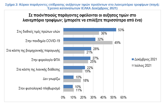 Όπως καταγράφεται στο σχήμα 2, αυτή είναι και η εικόνα που έχει η πλειοψηφία των καταναλωτών. Όπως αποτυπώνεται στην έρευνα καταναλωτών του ΙΕΛΚΑ που πραγματοποιήθηκε τον Δεκέμβριο 2021, η πλειοψηφία των καταναλωτών σε ποσοστό 53% αποδίδει τις ανατιμήσεις στις διεθνείς τιμές των πρώτων υλών, ακολουθεί η πανδημία COVID-19 με ποσοστό 32%, τα κόστη της βιομηχανικής παραγωγής με 28%, η φορολογία ΦΠΑ με 27% και τα κόστη λιανικής διάθεσης με 22%. Ιδιαίτερα έντονη είναι η μετακίνηση της γνώμης του κοινού από τον Ιούλιο του 2021 ως τον Δεκέμβριο του 2022 για την απόδοση των ανατιμήσεων από την πανδημία στις διεθνείς εξελίξεις. Τον Ιούλιο του 2021, όταν και οι ανατιμήσεις έκαναν την εμφάνιση τους, οι καταναλωτές τις απέδιδαν στην πανδημία σε ποσοστό 49%, ποσοστό που έπεσε στο 32%, ενώ αντίθετα το 36% απέδιδε τις ανατιμήσεις στις διεθνείς τιμές των πρώτων υλών, ποσοστό που αυξήθηκε στο 53%.
