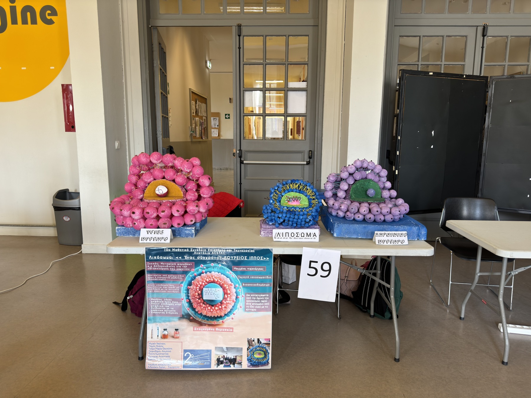 Σύμφωνα με τα παιδιά, «με τη χρήση απλών υλικών όπως, φελιζόλ, οδοντογλυφίδες, μπατονέτες και σταφίδες προσπαθήσαμε να αναπαραστήσουμε ένα υγιές κύτταρο, ένα καρκινικό κύτταρο καθώς και το λιπόσωμα. Οι μπάλες του φελιζόλ αναπαριστούν τις υδρόφιλες κεφαλές και οι οδοντογλυφίδες, τις υδρόφοβες ουρές. Ένα φωσφολιπίδιο αποτελείται από μια μπάλα (κεφαλή) και από δύο οδοντογλυφίδες (ουρές).