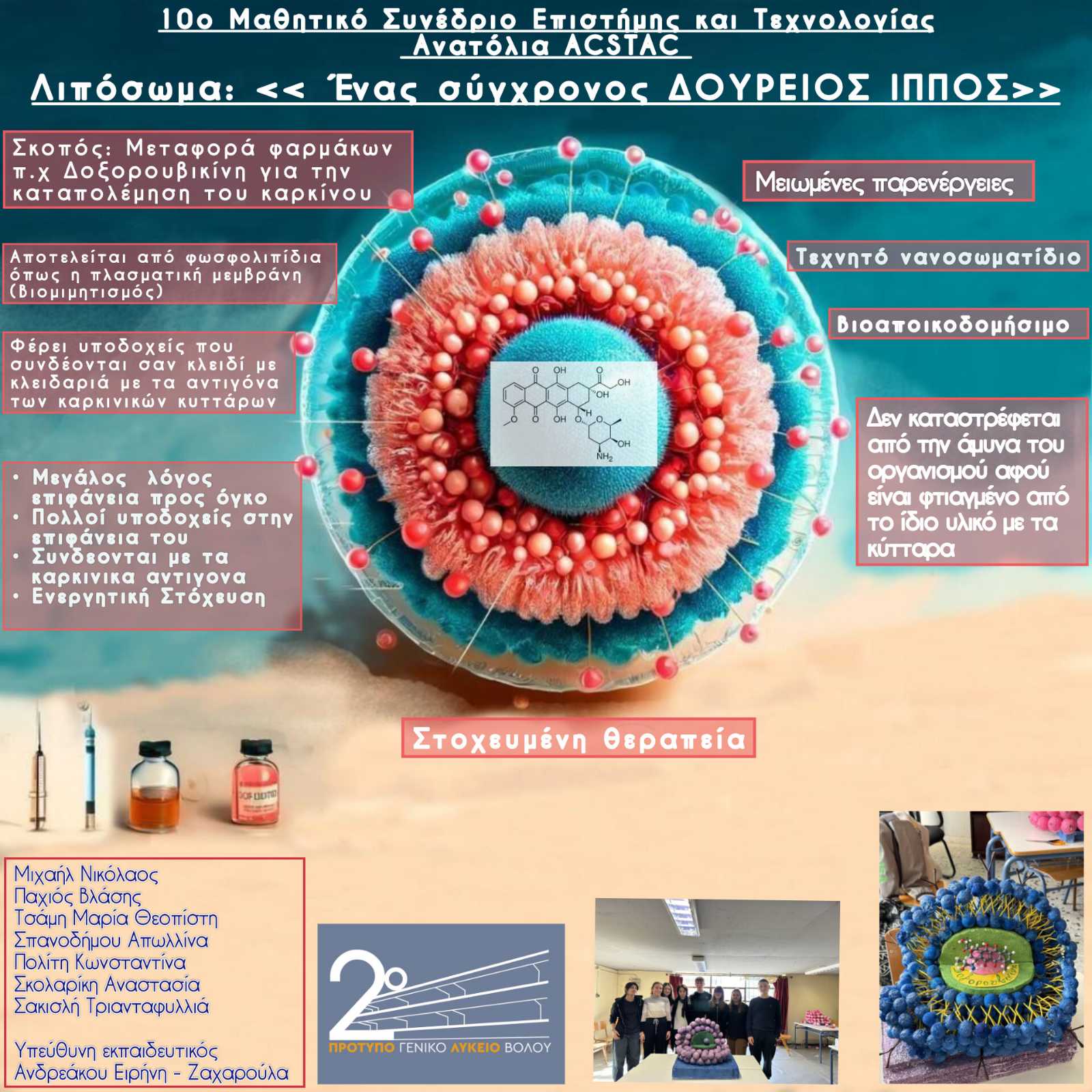 Όπως αναφέρουν στο «EY ZHN» οι ίδιοι μαθητές και οι μαθήτριες, «η εργασία μας επικεντρώνεται στην ενημέρωση και παρουσίαση μιας καινοτόμου θεραπευτικής μεθόδου για τον καρκίνο, που αποτελεί πρόσφατη επιστημονική ανακάλυψη. Στόχος μας ήταν να μελετήσουμε και να κατανοήσουμε τον τρόπο δράσης των λιποσωμάτων, τον πιο επιτυχημένο νανομεταφορέα φαρμάκων. Μέσω της μοντελοποίησης με απλά υλικά προσπαθήσαμε να οπτικοποιήσουμε τη δομή και λειτουργία του λιποσώματος, ενός νανοσωματιδίου μη ορατό με γυμνό μάτι.