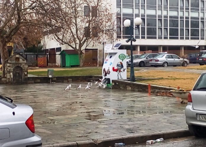 Ποιος νόμιζε αλήθεια, ότι από το μηχάνημα που εγκαταστάθηκε στον προαύλιο χώρο του δημαρχείου Βόλου, θα έβρισκαν φαγητό μόνο τα αδέσποτα; Η φωτογραφία μας διαψεύδει, καθώς μέχρι και οι … γλάροι φαίνεται ότι βρήκαν γευστικές τις σκυλο…λιχουδιές…