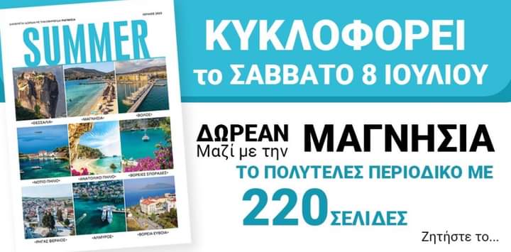 Κυκλοφορεί σήμερα μαζί με την εφημερίδα ΜΑΓΝΗΣΙΑ, το Summer 2023, καλώντας όλους τους αναγνώστες μας, αυτό το καλοκαίρι να ανακαλύψουν και άλλες, «κρυφές» ομορφιές… σε Μαγνησία, Β. Σποράδες, Θεσσαλία και Β. Εύβοια!