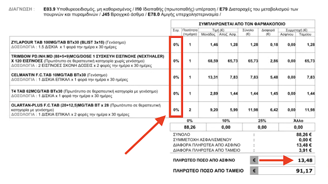 Αν κάποια φάρμακα συνταγογραφηθούν με συμμετοχή 0%, αυτό δε συνεπάγεται αυτομάτως ότι ο πολίτης δεν θα πληρώσει τίποτα. Το τελικό ποσό που καλείται να πληρώσει συνήθως είναι μεγαλύτερο, σε πολλές δε περιπτώσεις αρκετά μεγαλύτερο του … «δωρεάν 0%».