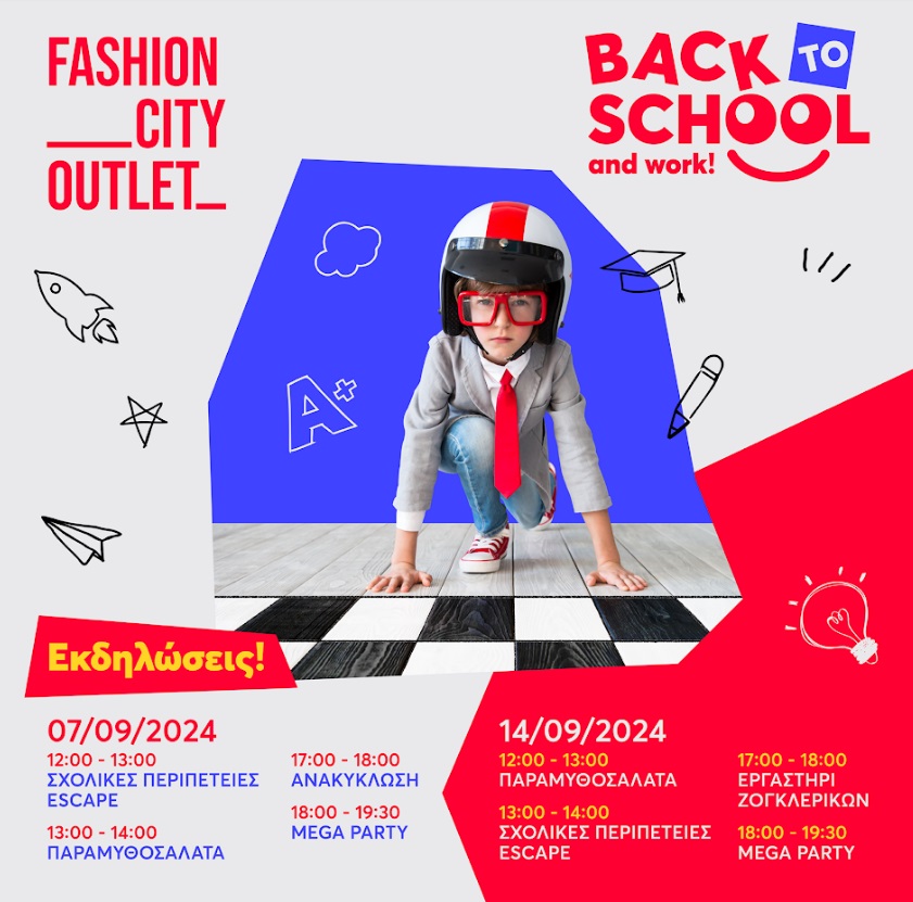 Προσφέροντας και φέτος σε απίστευτα χαμηλές τιμές όλα όσα χρειάζονται οι μαθητές σε ρούχα, παπούτσια, τσάντες, υπολογιστές και όλα τα σχολικά είδη το Fashion City Outlet παραμένει το κέντρο της καρδιάς μικρών και μεγάλων.