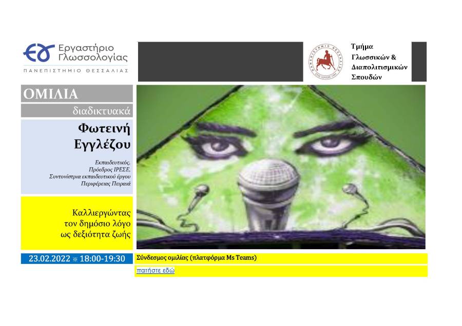 Στο πλαίσιο των δραστηριοτήτων του Εργαστηρίου Γλωσσολογίας (ΕργΓΛΩ) του Τμήματος Γλωσσικών & Διαπολιτισμικών Σπουδών του Πανεπιστημίου Θεσσαλίας, θα πραγματοποιηθεί σήμερα, 23 Φεβρουαρίου, στις 18.00 διαδικτυακή (μέσω MS Teams) ομιλία της εκπαιδευτικού, Προέδρου του ΙΡΕΣΕ και Συντονίστριας Εκπαιδευτικού Έργου Περιφέρειας Πειραιά, κ. Φωτεινής Εγγλέζου.