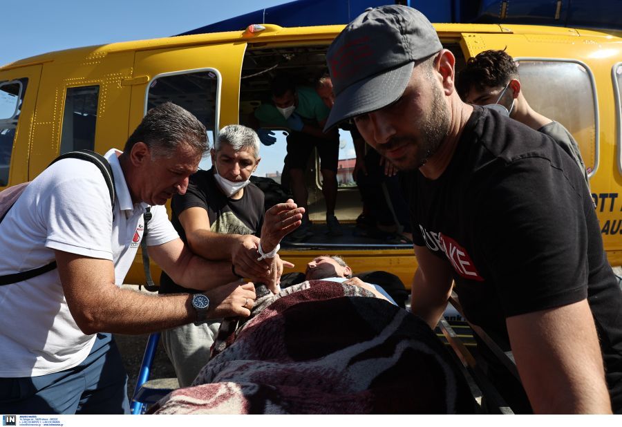 Κάτω από δύσκολες συνθήκες εθελοντές που έφτασαν από το Μεσολόγγι μεταφέρουν με ασφάλεια τους ηλικιωμένους στα χέρια.