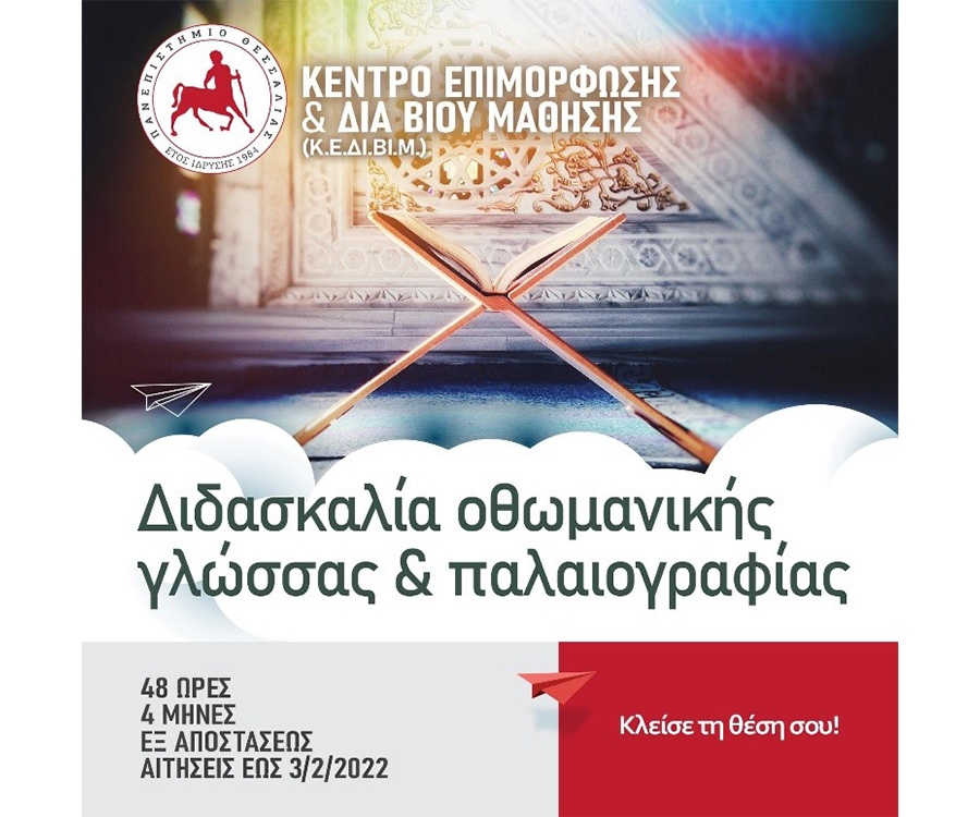 Το Πανεπιστήμιο Θεσσαλίας και το Κ.Ε.ΔΙ.ΒΙ.Μ. παρουσιάζει το εξ αποστάσεως πρόγραμμα με τίτλο «Διδασκαλία οθωμανικής γλώσσας & παλαιογραφίας» που στοχεύει στην εξοικείωση των επιμορφούμενων με τις διάφορες πηγές της Οθωμανικής Ιστορίας παρέχοντας τη δυνατότητα προσέγγισης και αξιοποίησης των πηγών κειμενικού χαρακτήρα.