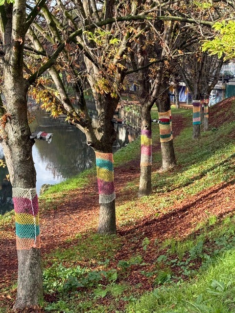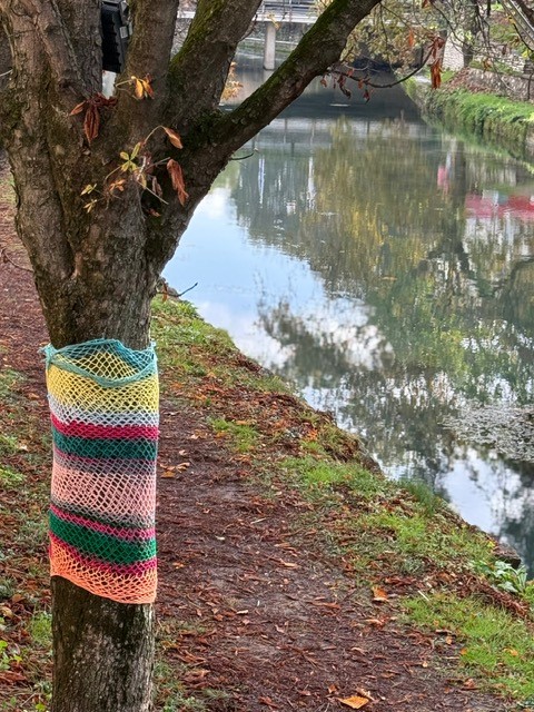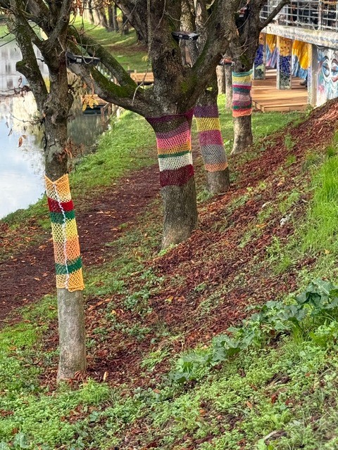 Τα πλεκτά έργα δημιουργήθηκαν στο πλαίσιο δημιουργικής δράσης με τη συμμετοχή παιδιών, τα οποία με ενθουσιασμό, φαντασία και συνεργασία έπλεξαν κομμάτια γεμάτα χρώμα και συναίσθημα. Στη συνέχεια, τα έργα τοποθετήθηκαν στους κορμούς των δέντρων, προσφέροντας μία εικόνα χαράς και ζεστασιάς σε όσους περνούν από το σημείο.