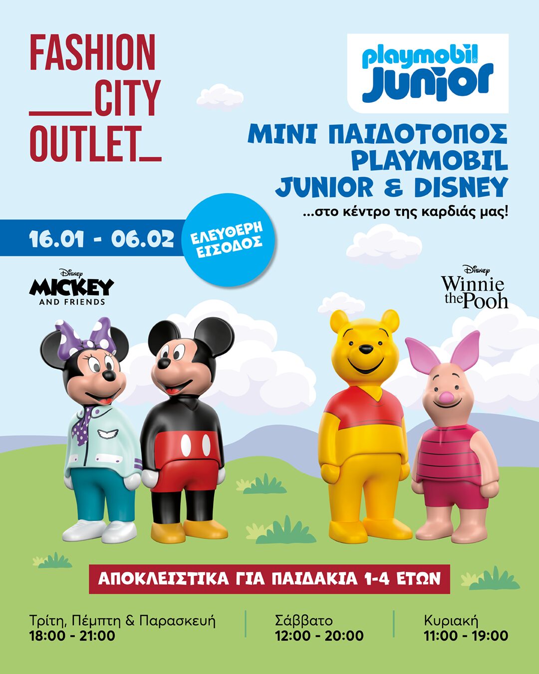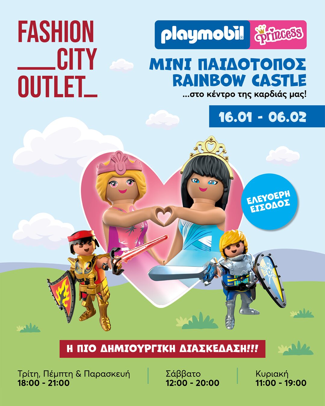 Από 16 Ιανουαρίου έως και 6 Φεβρουαρίου, ο Μίκυ και ο Γουίνι, Ιππότες και Πριγκίπισσες, και ολόκληρο το Κάστρο του Ουράνιου Τόξου προσκαλούν τους μικρούς μας φίλους σε έναν κόσμο γεμάτο χρώματα, ρόλους και ιστορίες. Μέσα από το παιχνίδι, τα παιδιά αναπτύσσουν τη φαντασία, τη λεπτή κινητικότητα και τη γνωστική τους κατανόηση, σε ένα περιβάλλον ασφαλές, χαρούμενο και απόλυτα σχεδιασμένο για τις ηλικίες τους.