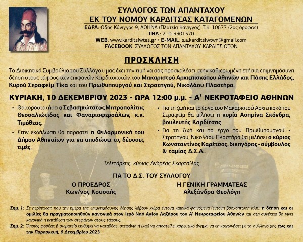 Ο Σύλλογος των Απανταχού Καρδιτσιωτών προσκαλεί όλους τους Καρδιτσιώτες και Θεσσαλούς την προσεχή Κυριακή, 10 Δεκεμβρίου 2023 και ώρα 12.00′ μ.μ. στο Α’ Νεκροταφείο Αθηνών (περιοχή «Μετς» Παγκρατίου), ότε και όπου θα τελέσει με τη δέουσα επισημότητα την καθιερωμένη ετήσια επιμνημόσυνη δέηση στους τάφους των επιφανών Καρδιτσιωτών, του Μακαριστού Αρχιεπισκόπου Αθηνών και πάσης Ελλάδος, Κυρού Σεραφείμ Τίκα (καταγόταν από το Αρτεσιανό Καρδίτσας) και του Πρωθυπουργού & Στρατηγού, Νικολάου Πλαστήρα (γεννήθηκε στην Καρδίτσα και καταγόταν από το Μορφοβούνι Λίμνης Πλαστήρα).