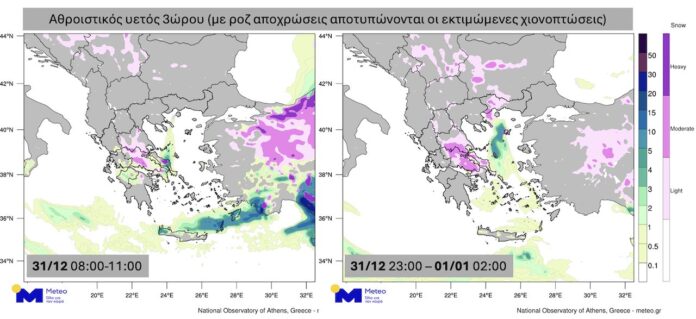 Στην παρακάτω ομάδα χαρτών παρουσιάζεται ο αθροιστικός υετός 3ώρου για τις 08:00-11:00 της Τετάρτης 31/12 και 23:00 της Τετάρτης 31/12 – 02:00 της Πέμπτης 01/01/2026, καθώς και η εκτιμώμενη αθροιστική χιονόστρωση στην Ανατολική Στερεά και στην Αττική έως και το βράδυ της Πέμπτης 01/01/2026.