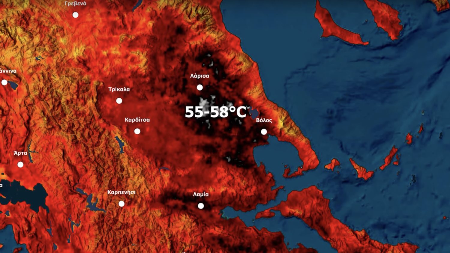 Το ειδικό όργανο μέτρησης θερμοκρασίας εδάφους του ευρωπαϊκού δορυφόρου Sentinel 3 κατέγραψε θερμοκρασίες άνω των 50 °C στις 11:48 το πρωί της Παρασκευής 14/07. Η απόλυτα μέγιστη τιμή καταγράφηκε στον θεσσαλικό κάμπο, στον Νομό Λάρισας και ήταν ίση με 58 °C.
