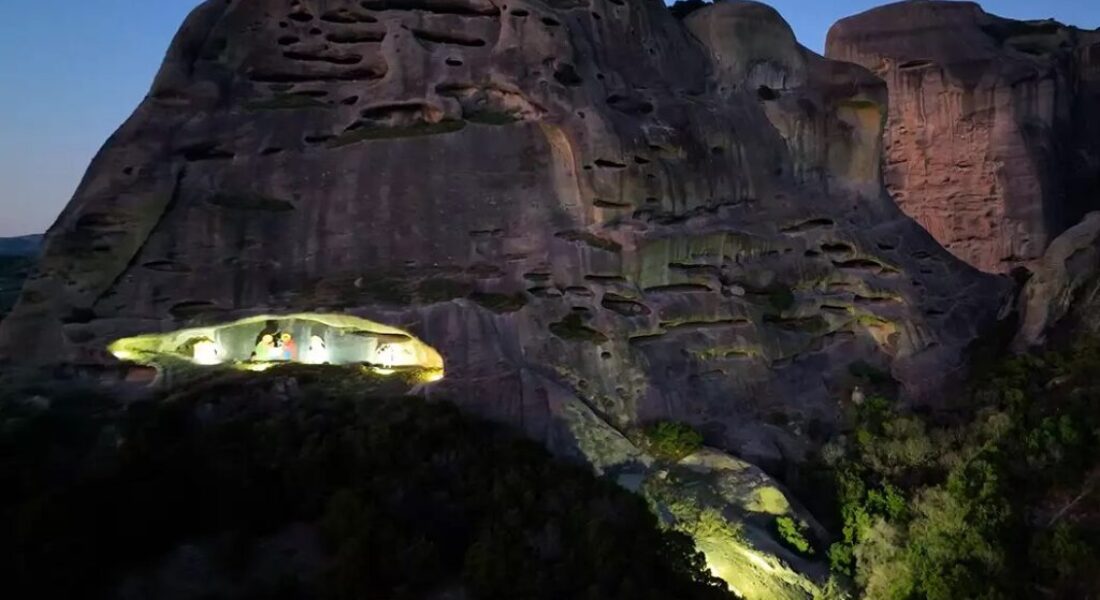 Στο επιβλητικό σκηνικό των Μετεώρων δεσπόζει και φέτος η μοναδική «ουράνια» φάτνη, σκαρφαλωμένη μέσα σε μια σπηλιά, πάνω από την πόλη της Καλαμπάκας. Η ξεχωριστή αυτή φάτνη, που φωταγωγήθηκε την Κυριακή, εναρμονίζεται με το ιδιαίτερο γεωλογικό φαινόμενο των Μετεώρων και συνάδει με το πνεύμα κατάνυξης και πνευματικής ευδαιμονίας της ιερής Ουράνιας Πολιτείας.