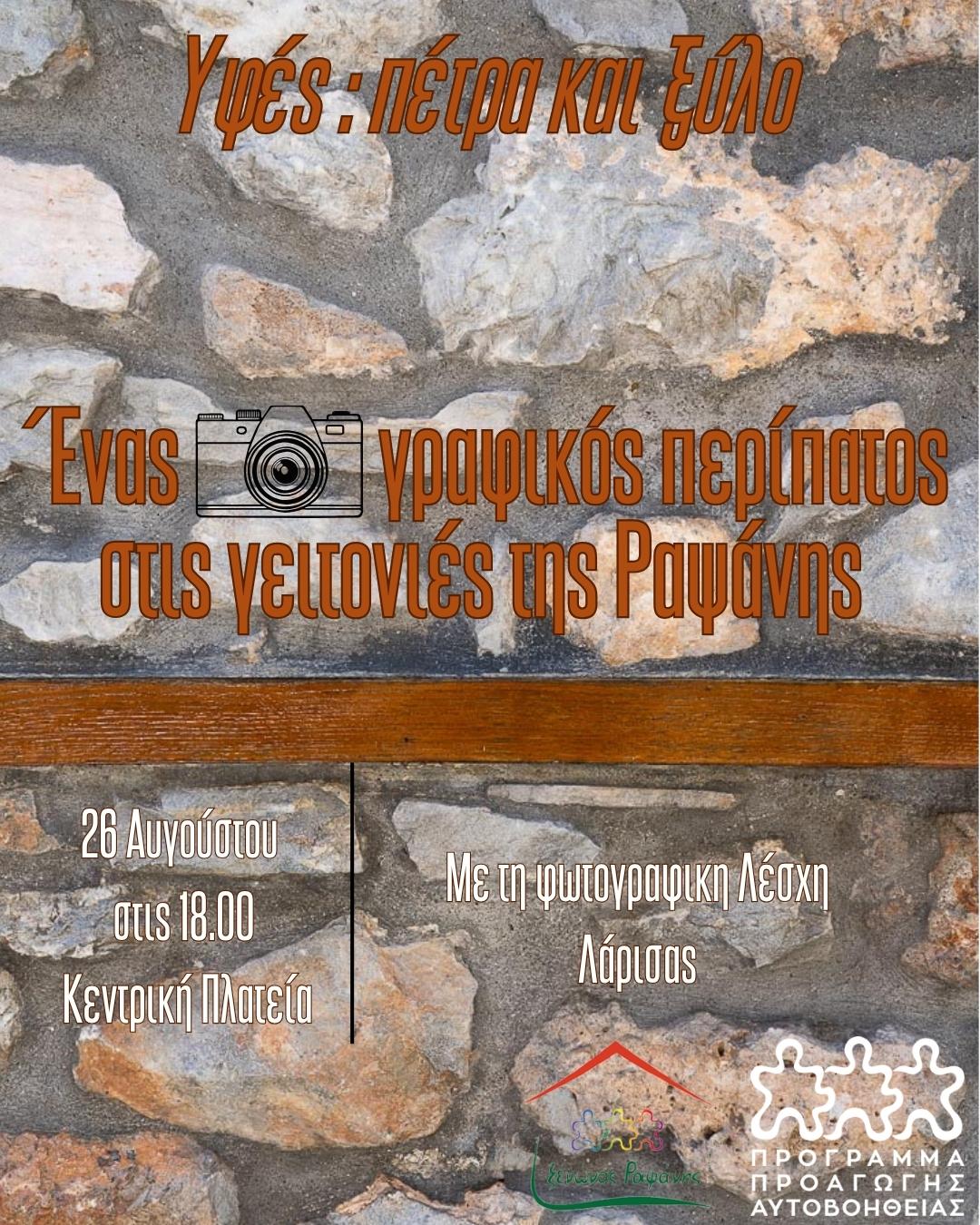 Οι καλοκαιρινές δράσεις που διοργανώνει το Πρόγραμμα Προαγωγής Αυτοβοήθειας – «Ξενώνας Ραψάνης» του ΑΠΘ, σε συνεργασία με τη Δημοτική Βιβλιοθήκη Ραψάνης, ολοκληρώνονται στις 26 Αυγούστου, με την πραγματοποίηση ενός φωτογραφικού περιπάτου με τίτλο «υφές: πέτρα και ξύλο», με τη Φωτογραφική Λέσχη Λάρισας.