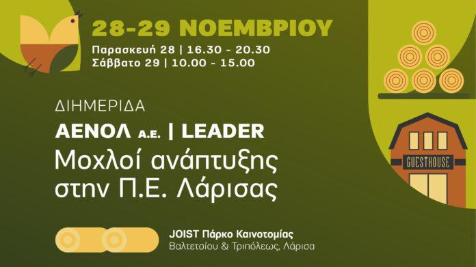Ο Αναπτυξιακός Οργανισμός Τοπικής Αυτοδιοίκησης Νομού Λάρισας Α.Ε. – ΑΕΝΟΛ Α.Ε., με αφορμή την ολοκλήρωση του προγράμματος CLLD/LEADER του Προγράμματος «Αγροτική Ανάπτυξη της Ελλάδας 2014-2020» (ΠΑΑ), διοργανώνει επετειακή εκδήλωση με τίτλο «ΑΕΝΟΛ και LEADER: Μοχλοί Ανάπτυξης στην Π.Ε. Λάρισας», στο πλαίσιο εμψύχωσης του τοπικού πληθυσμού και των ενεργειών προβολής του τοπικού προγράμματος CLLD/LEADER και την παρουσίαση των αποτελεσμάτων του.