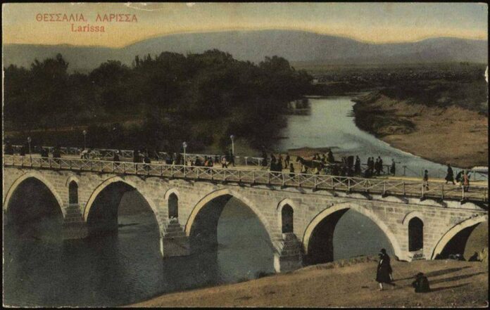Η γέφυρα του Πηνειού στη Λάρισα, σε επιχρωματισμένη καρτ ποστάλ του Στεφ. Στουρνάρα (Βόλος), No 114, επανέκδοση του επιστολικού δελταρίου No.8 του ιδίου φωτογράφου-εκδότη.