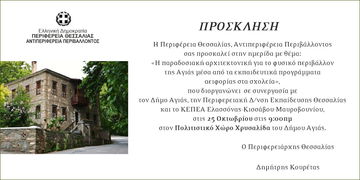 Η Περιφέρεια Θεσσαλίας, Αντιπεριφέρεια Περιβάλλοντος, διοργανώνει ημερίδα με θέμα «Η παραδοσιακή αρχιτεκτονική και το φυσικό περιβάλλον της Αγιάς μέσα από τα εκπαιδευτικά προγράμματα αειφορίας στα σχολεία», σε συνεργασία με τον Δήμο Αγιάς, την Περιφερειακή Διεύθυνση Εκπαίδευσης Θεσσαλίας και το ΚΕΠΕΑ Ελασσόνας–Κισσάβου–Μαυροβουνίου.