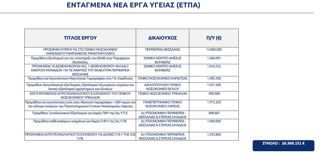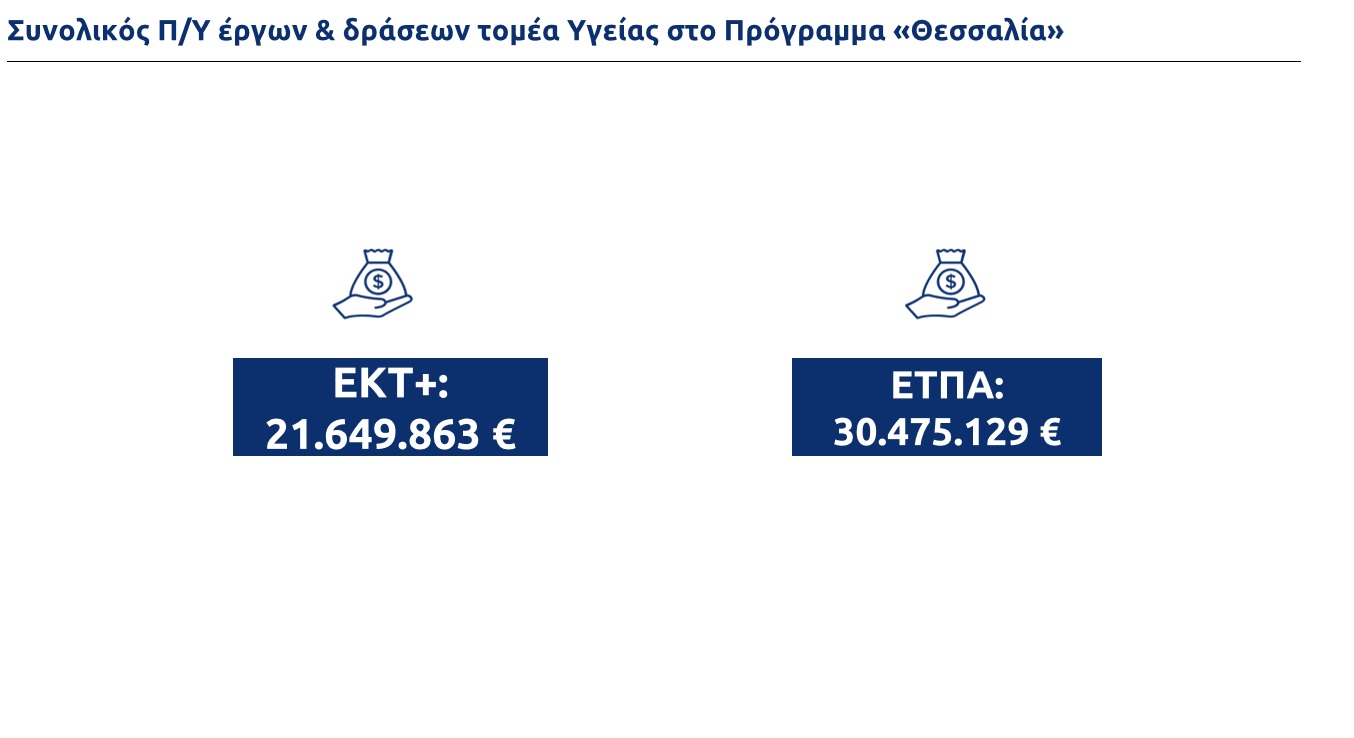Μια σειρά από έργα που αναβαθμίζουν κτιριακά τα νοσοκομεία, τα Κέντρα Υγείας και τα περιφερειακά ιατρεία ενώ παράλληλα θα βελτιώσουν τον ιατροτεχνολογικό εξοπλισμό των υγειονομικών δομών, χρηματοδοτεί η Περιφέρεια Θεσσαλίας μέσω του ΕΣΠΑ με 52 εκατομμύρια ευρώ και δικαιούχο την 5η ΥΠΕ. Ταυτόχρονα άλλα 5,2 εκατ. ευρώ θα διατεθούν από το Πρόγραμμα Δημοσίων Επενδύσεων για τη στήριξη του Πανεπιστημιακού Νοσοκομείου, το οποίο θα αποκτήσει σύγχρονα μηχανήματα με τεχνολογία αιχμής, με στόχο να ενισχυθεί μεταξύ άλλων η Ακτινολογική-Ογκολογική Κλινική του και να δημιουργηθεί μονάδα μεταμόσχευσης μυελού των οστών.