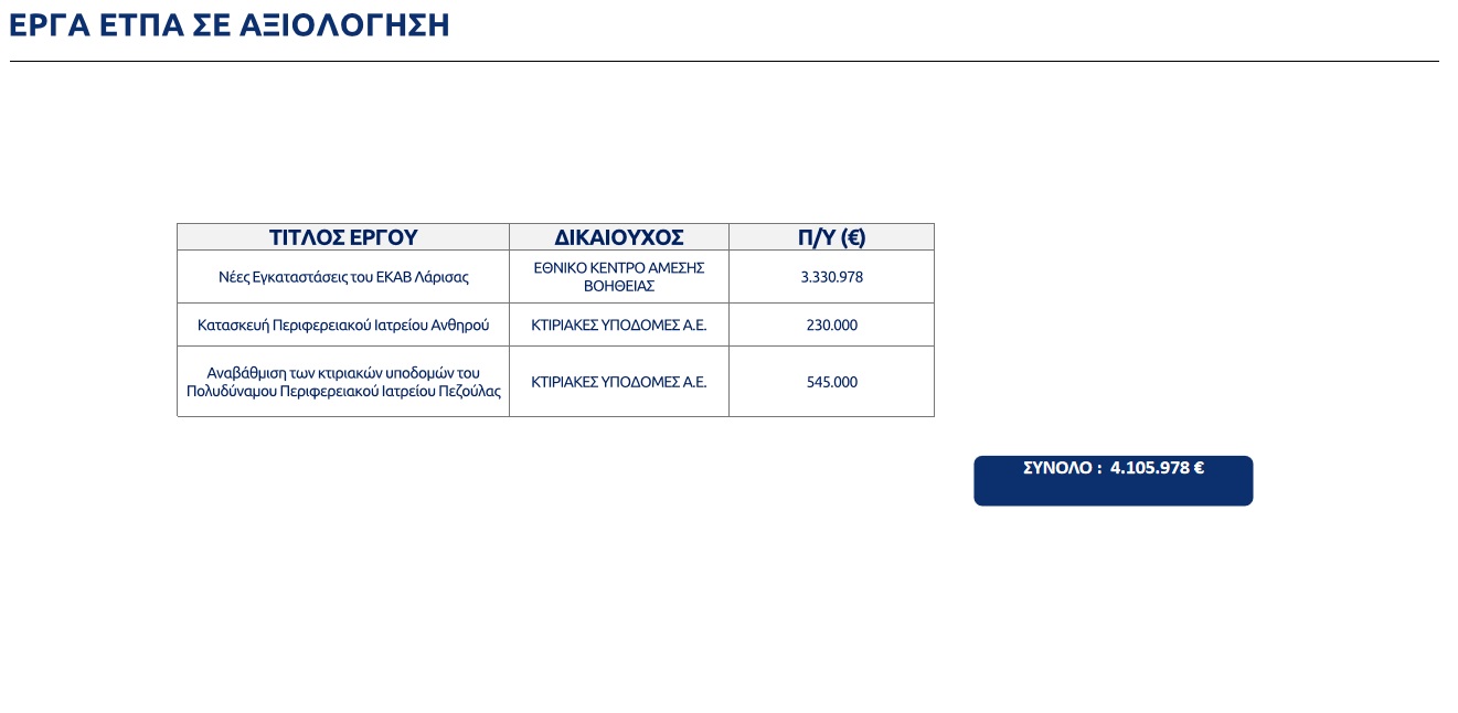 ΕΠΙΣΚΕΥΗ ΚΑΙ ΣΥΝΤΗΡΗΣΗ ΠΕΡΙΦΕΡΕΙΑΚΩΝ ΙΑΤΡΕΙΩΝ ΣΤΗΝ ΠΕΡΙΦΕΡΕΙΑ ΘΕΣΣΑΛΙΑΣ ΣΕ ΚΡΑΝΙΑ ΕΛΑΣΣΟΝΑΣ, ΑΜΠΕΛΩΝΑ, .ΚΑΡΥΑ, ΦΑΛΑΝH