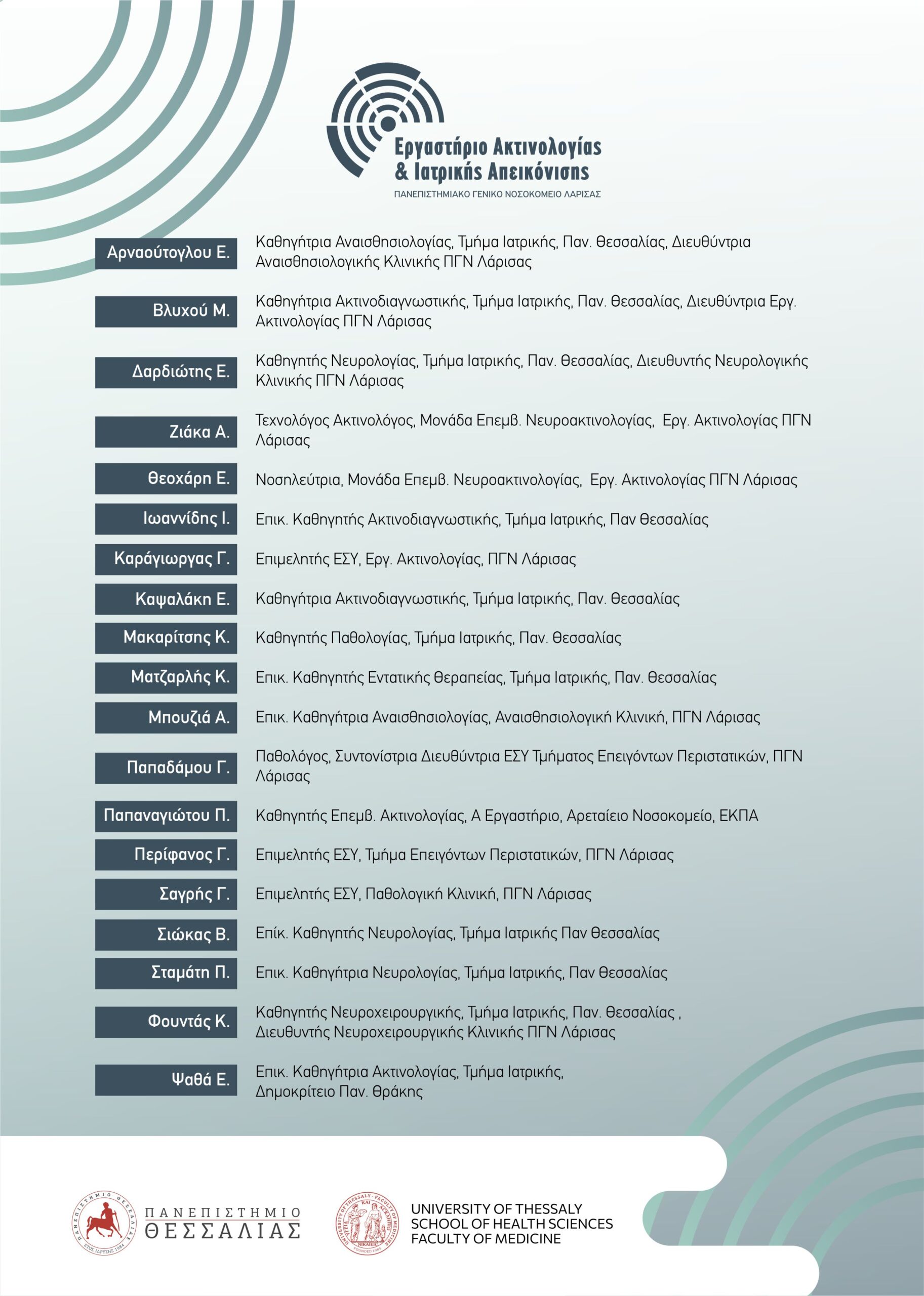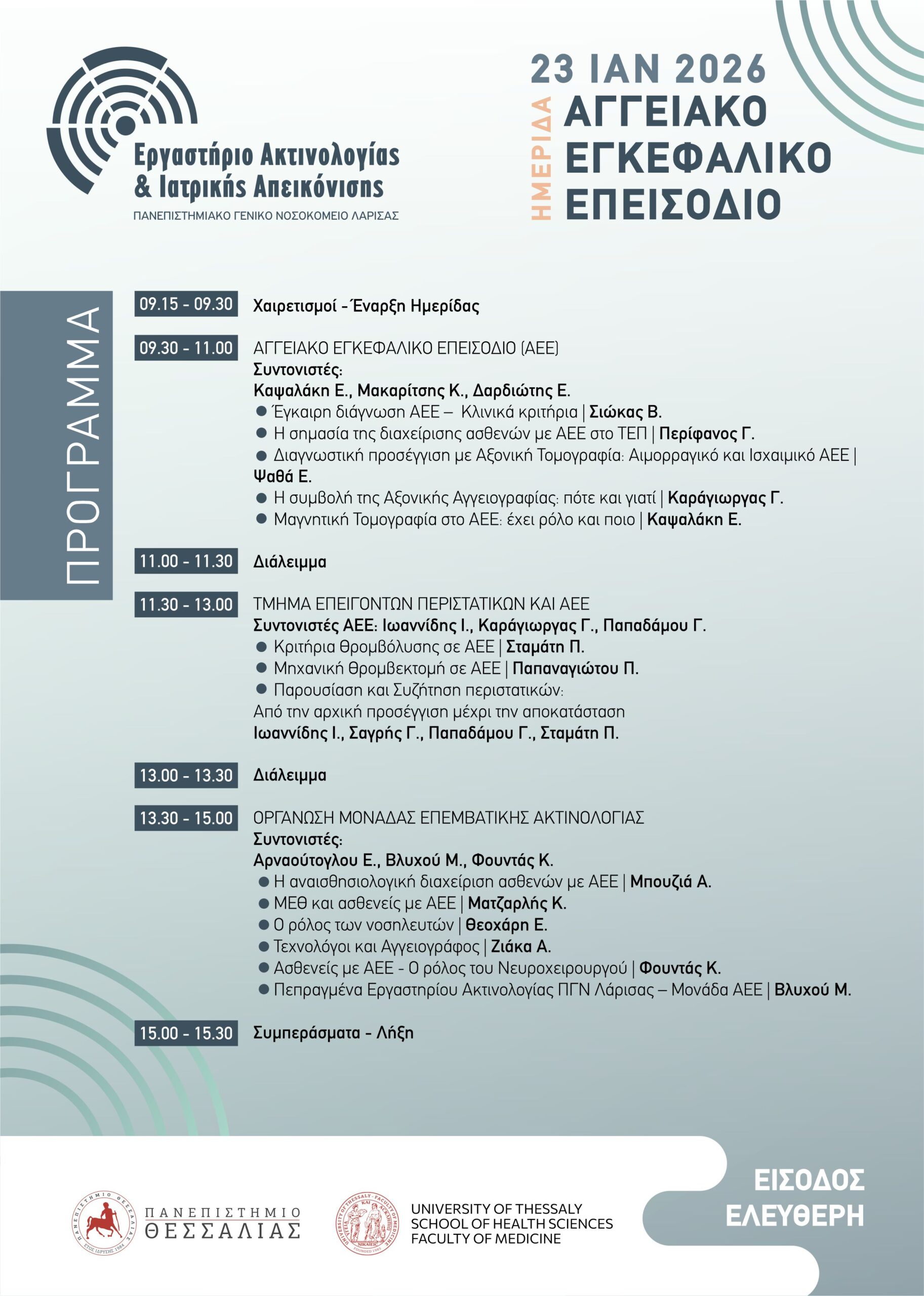 Το Εργαστήριο Ακτινολογίας και Ιατρικής Απεικόνισης του Πανεπιστημιακού Γενικού Νοσοκομείου Λάρισας διοργανώνει ημερίδα με θέμα το Αγγειακό Εγκεφαλικό Επεισόδιο, την Παρασκευή 23 Ιανουαρίου 2026, στην Ιατρική Σχολή του Πανεπιστημίου Θεσσαλίας, στο Βιόπολις, στο Αμφιθέατρο Μ2.