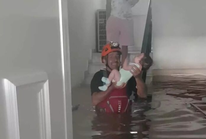 Ο διασώστης της ΕΜΑΚ κρατάει στοργικά στα χέρια του το μωρό λέγοντάς του «ψυχούλα μου» για να μην φοβηθεί την ώρα που περνούσαν μέσα από τα νερά που είχαν πλημμυρίσει το σπίτι.