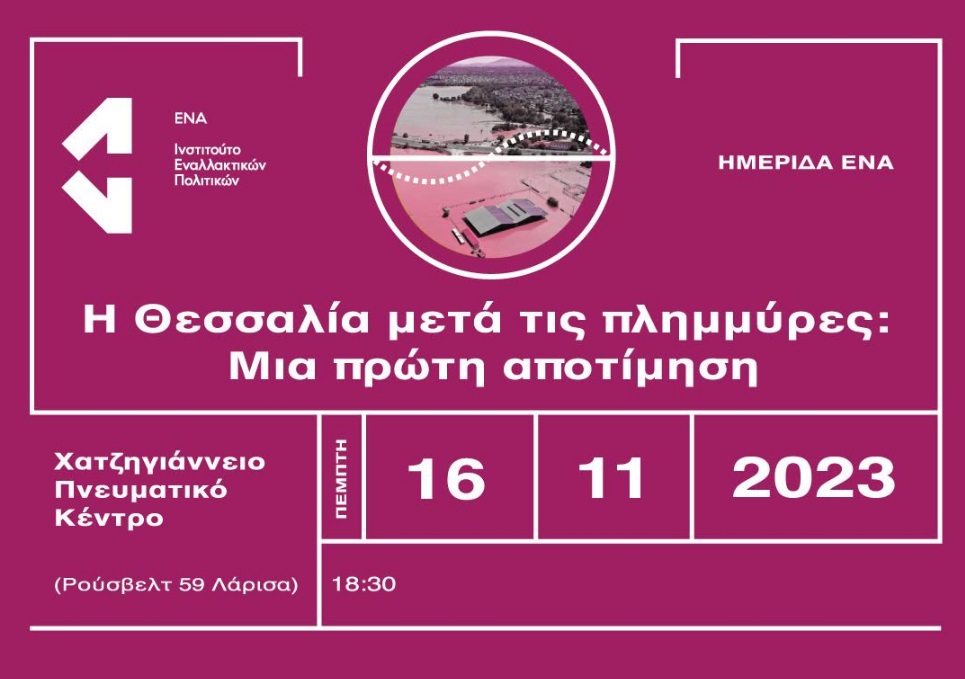 Το Ινστιτούτο Εναλλακτικών Πολιτικών ΕΝΑ διοργανώνει την Πέμπτη 16 Νοεμβρίου 2023, στις 18:30 στο Χατζηγιάννειο Πνευματικό Κέντρο της Λάρισας, ημερίδα με θέμα «Η Θεσσαλία μετά τις πλημμύρες: Μια πρώτη αποτίμηση».
