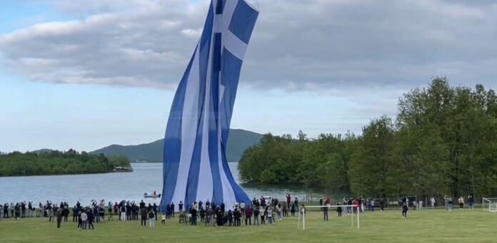 Η μεγαλύτερη ελληνική σημαία στον κόσμο, μεγέθους 1.500 τ.μ., υψώθηκε πάνω από τη λίμνη Πλαστήρα, με φόντο τα κεντρικά θεσσαλικά Άγραφα.