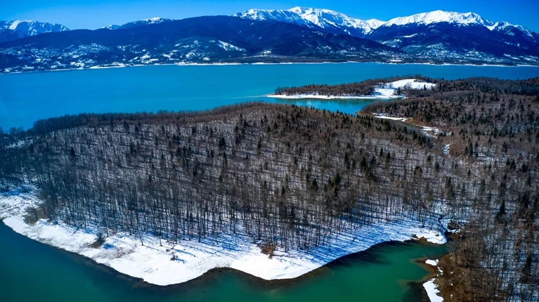 Μαγευτικό είναι και το τοπίο στην χιονισμένη λίμνη Πλαστήρα, που βρίσκεται στο νομό Καρδίτσας. Οι ολόλευκες όχθες της δημιουργούν ένα ειδυλλιακό σκηνικό.