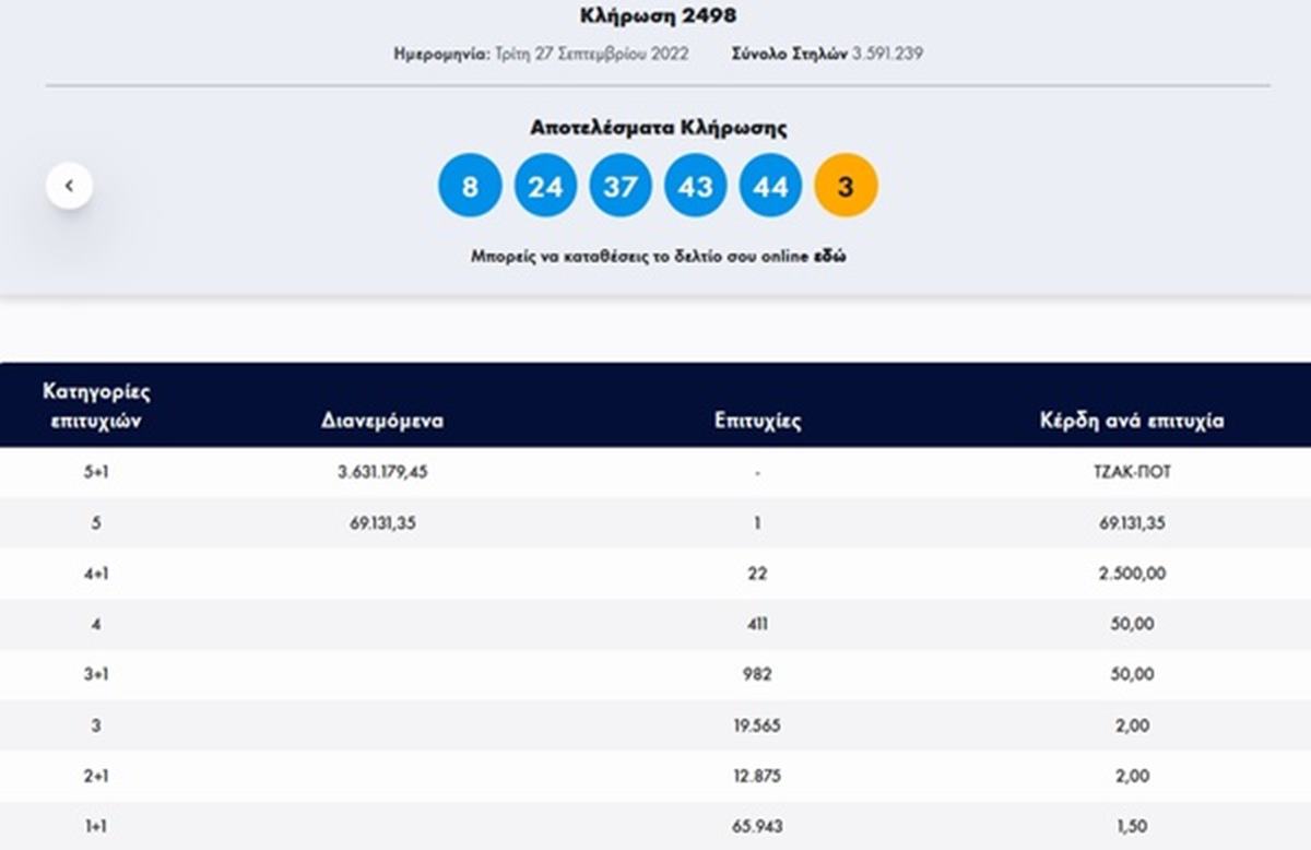 Στην πρώτη κατηγορία είχαμε τζακ-ποτ και έτσι στην επόμενη κλήρωση θα μοιραστούν τουλάχιστον 4.100.000 ευρώ.