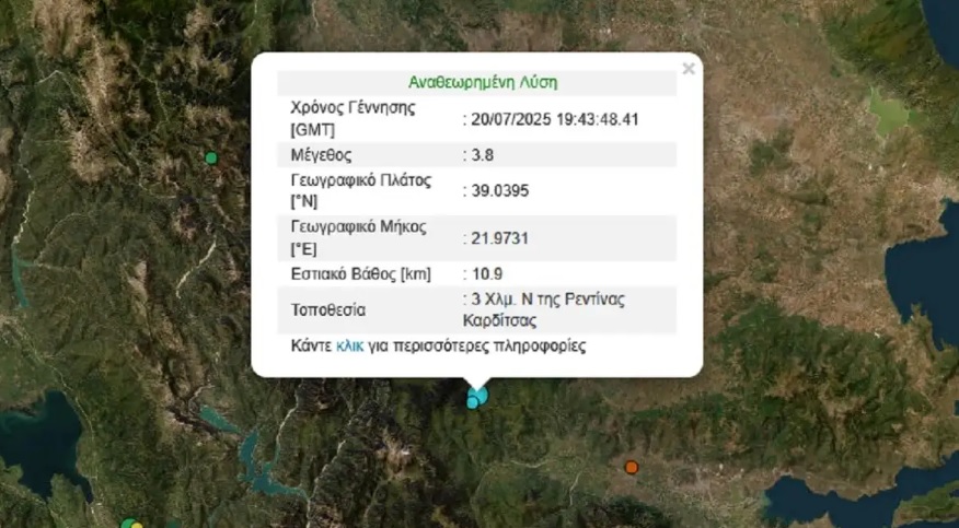 Σεισμός 3,8 Ρίχτερ σημειώθηκε το βράδυ της Κυριακής (20/07/2025) στην Καρδίτσα και συγκεκριμένα τρία χιλιόμετρα νότια της Ρεντίνας.