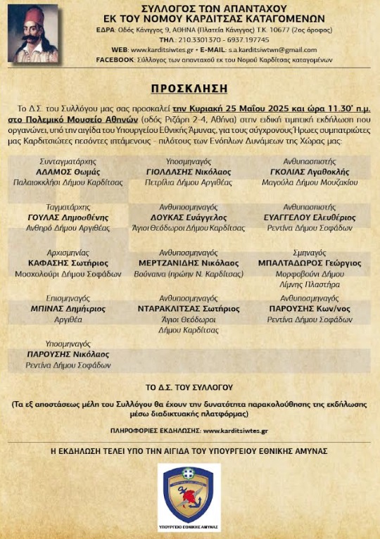 Ο Σύλλογος των απανταχού εκ του Νομού Καρδίτσας καταγομένων οργανώνει την Κυριακή, 25 Μαϊου 2025 και ώρα 11.30 π.μ.’ στο Πολεμικό Μουσείο Αθηνών (οδ. Ριζάρη 2-4 & Λεωφ. Βασιλίσσης Σοφίας, ΑΘΗΝΑ), ειδική τιμητική εκδήλωση που οργανώνει, υπό την αιγίδα του Υπουργείου Εθνικής Άμυνας, για τους Σύγχρονους Ήρωες συμπατριώτες μας Καρδιτσιώτες πεσόντες ιπτάμενους-πιλότους των Ενόπλων Δυνάμεων της Χώρας μας: