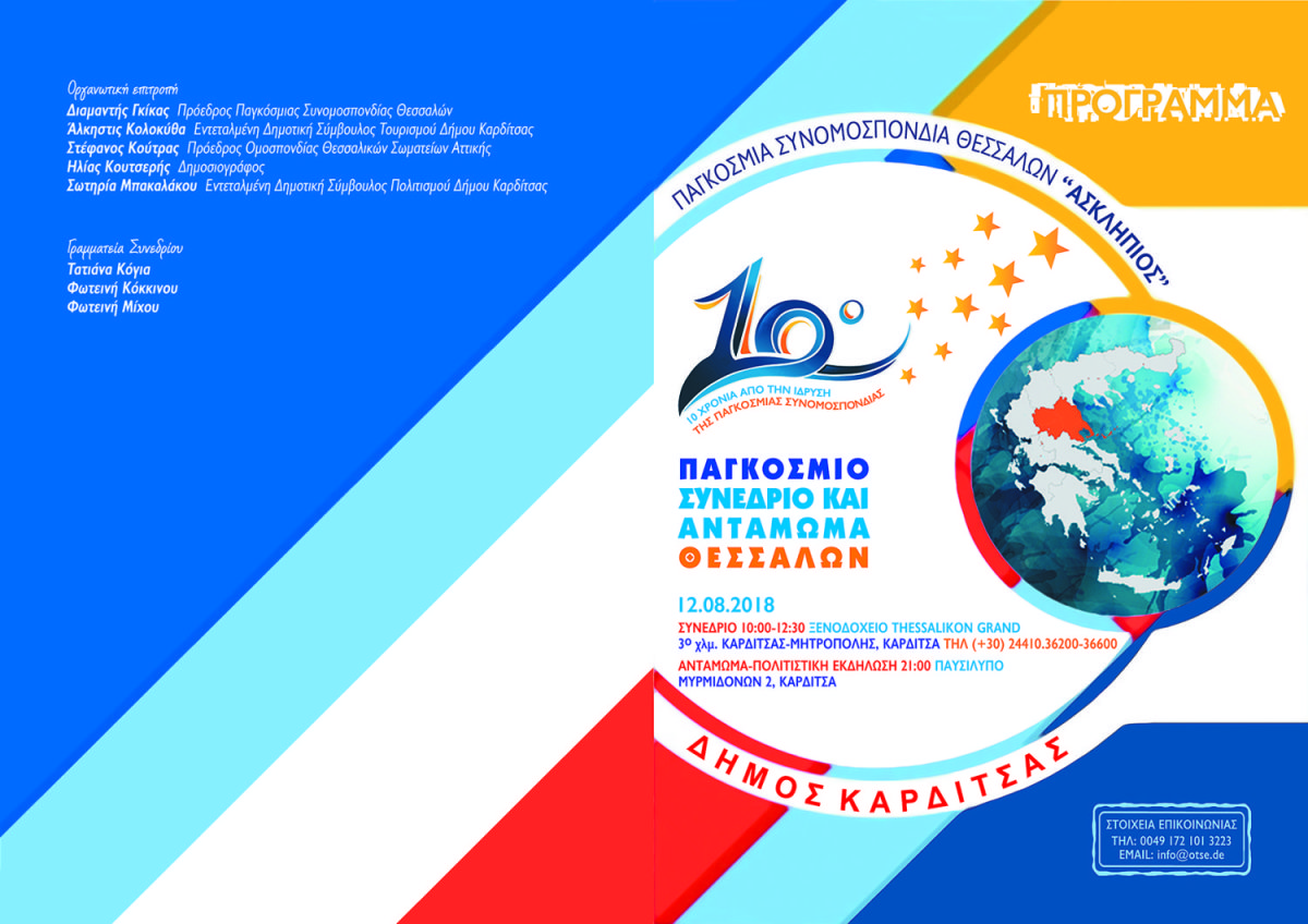 Την πρώτη δεκαετία, γεμάτη με χρώματα, αρώματα, γεύσεις, ήχους, λόγους, χορούς και εικόνες που αποπνέουν τη … μοναδική Θεσσαλία, από άκρη σε άκρη του κόσμου, γιορτάζει η Παγκόσμια Συνομοσπονδία Θεσσαλών «ΑΣΚΛΗΠΙΟΣ», διοργανώνοντας παράλληλα, το «10ο Παγκόσμιο συνέδριο Θεσσαλών», το οποίο θα πραγματοποιηθεί στην Καρδίτσα στις 12 Αυγούστου 2018.