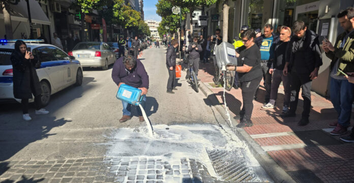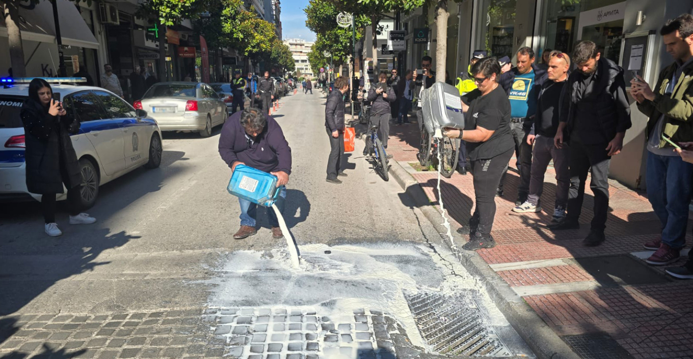 Δεκάδες κτηνοτρόφοι βρέθηκαν το πρωί της Πέμπτης έξω από το πολιτικό γραφείο του υφυπουργού Αγροτικής Ανάπτυξης και Τροφίμων, Χρήστου Κέλλα στη Λάρισα και έχυσαν γάλα, θέλοντας έτσι να διαμαρτυρηθούν για την πολιτική που ασκεί η κυβέρνηση.