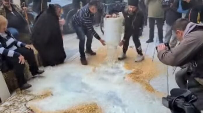 Δυναμική κινητοποίηση μπροστά από το δικαστικό Μέγαρο Λάρισας πραγματοποιούν αυτήν την ώρα δεκάδες κτηνοτρόφοι από όλη τη Θεσσαλία, οι οποίοι πέταξαν γάλα, μπάλες από άχυρα και καλαμπόκι έξω από το κτίριο.