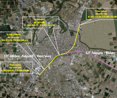 Στο μήκος αυτό των περιλαμβάνονται δύο σιδηροδρομικοί σταθμοί, Σ.Σ. Μεζούρλο και Σ.Σ. Λάρισας, τρεις ισόπεδες οδικές διαβάσεις (στην οδό Βόλου, στην οδό Καραγάτση και στην οδό Αγιάς), υπόγειες διαβάσεις πεζών, δύο πεζογέφυρες καθώς και το τεχνικό του ποταμού Πηνειού.
