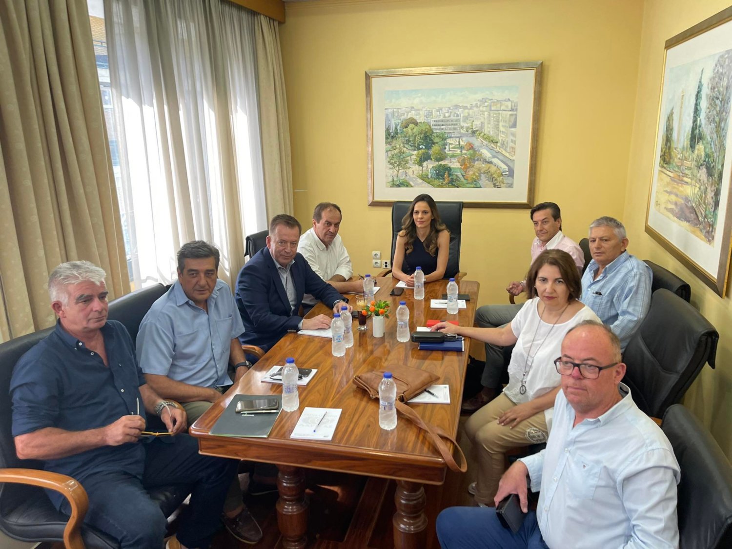 Στο πλαίσιο αυτό συναντάται με τη Διοίκηση του Επιμελητηρίου Λάρισας, του Εμπορικού Συλλόγου Λάρισας και του ΣΘΕΒ.